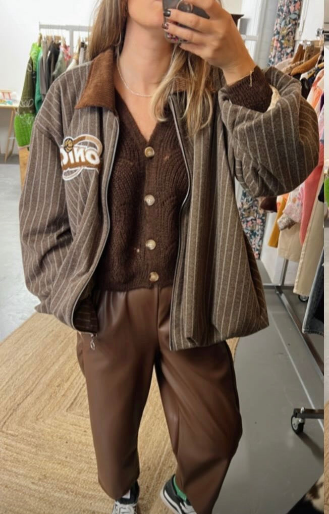 Sa coupe ample et son tissu à fines rayures lui donnent un charme décontracté et un look 90’s assumé.