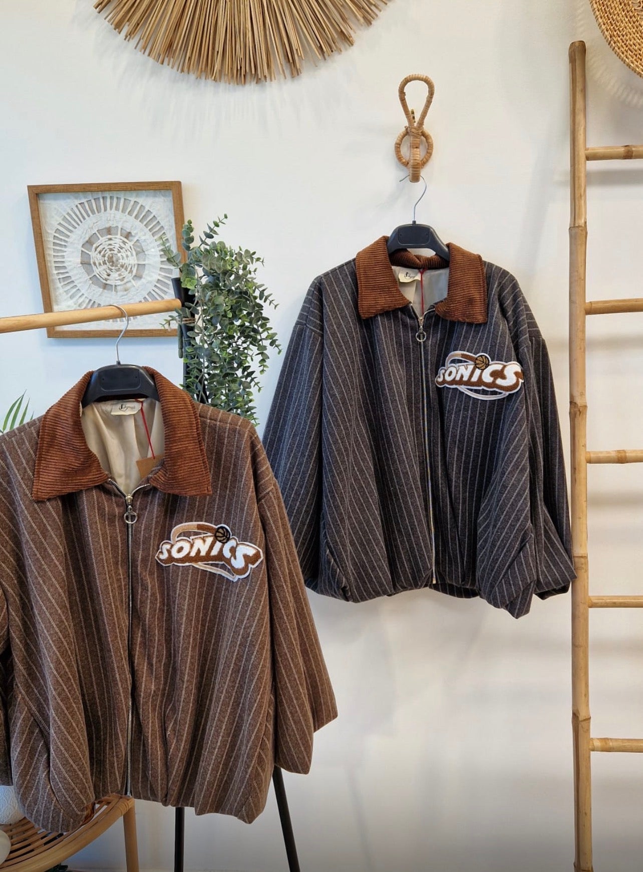 Cette veste oversize esprit varsity apporte une touche rétro irrésistible à vos tenues. Avec son col en velours côtelé contrasté et son patch brodé “Sonics”, elle allie confort et style urbain.
