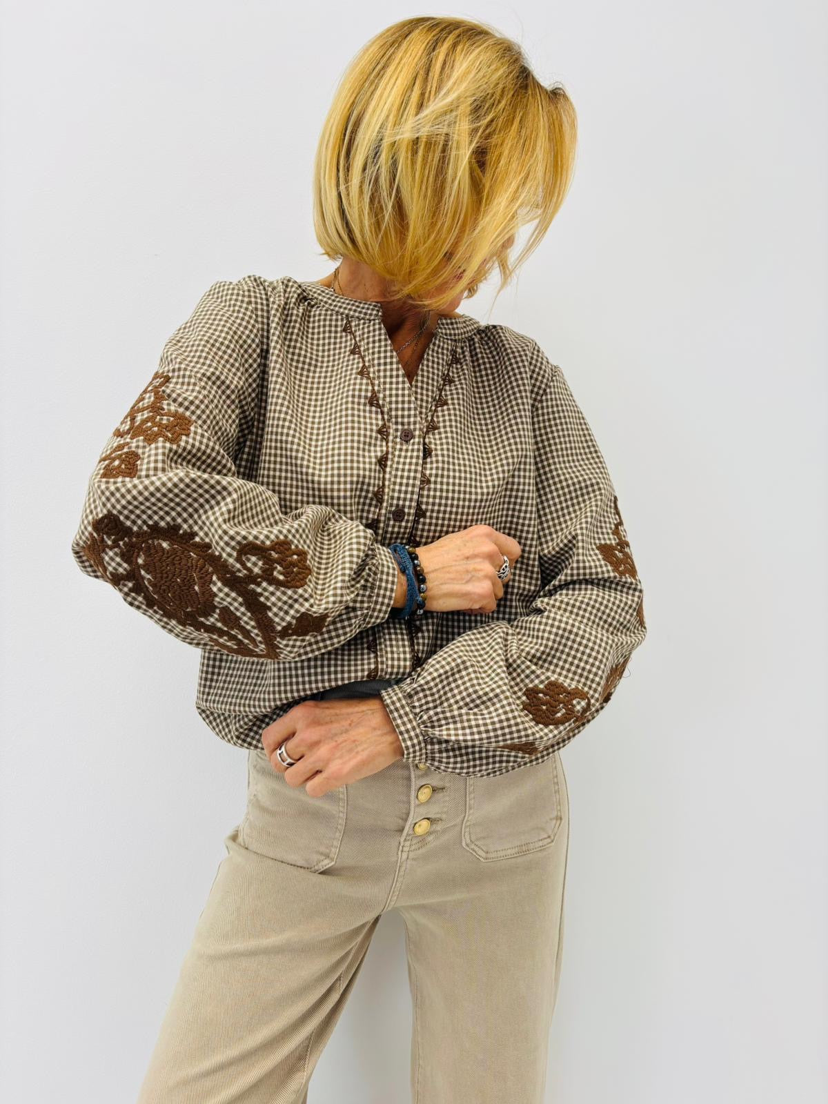 Cette blouse à carreaux fins se distingue par ses broderies florales ton sur ton sur les manches et ses jolis boutons recouverts sur le devant.