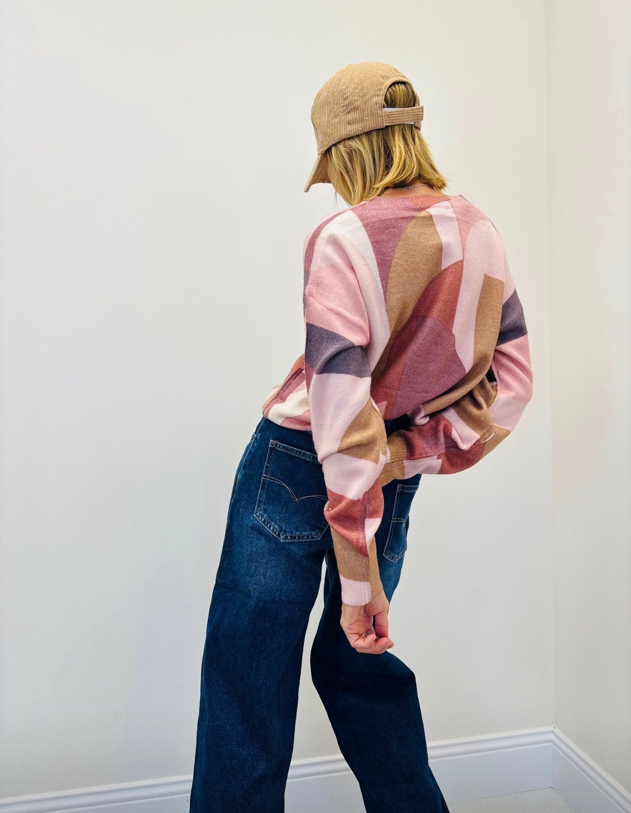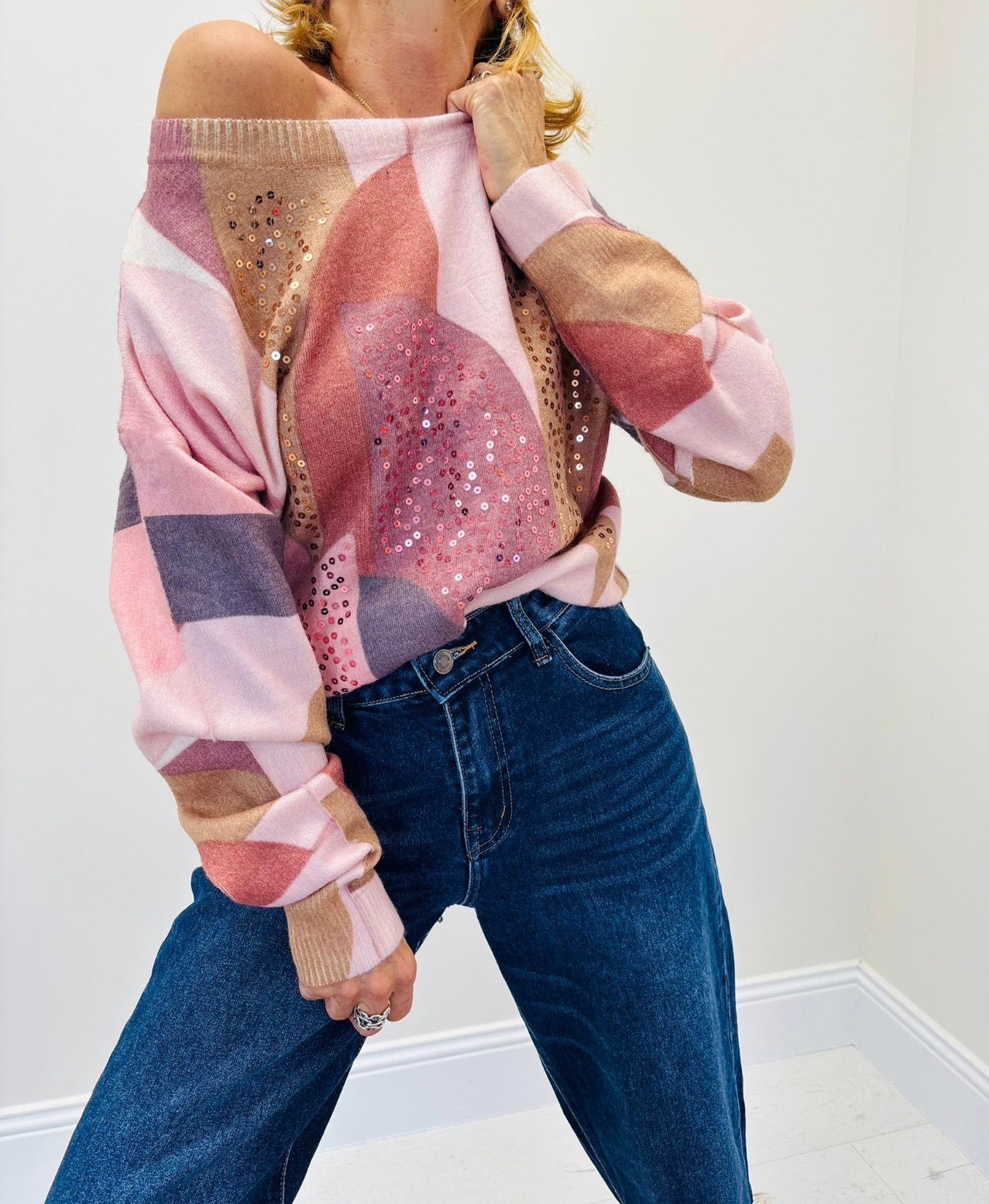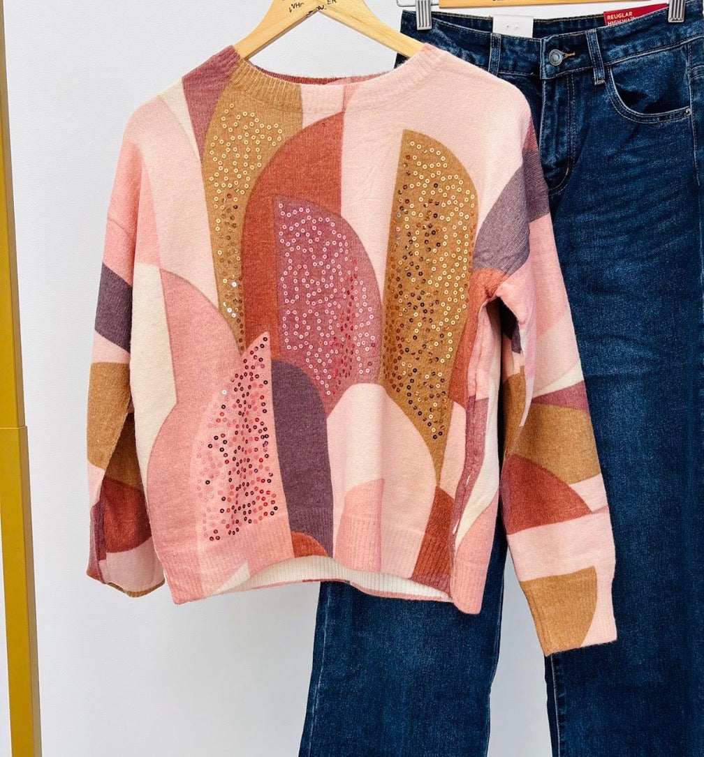 On craque pour son imprimé graphique aux tons tendres de rose, beige et caramel, sublimé par une pluie discrète de sequins scintillants sur le devant. Sa maille fine et douce offre un confort absolu tout en apportant une touche féminine et moderne.