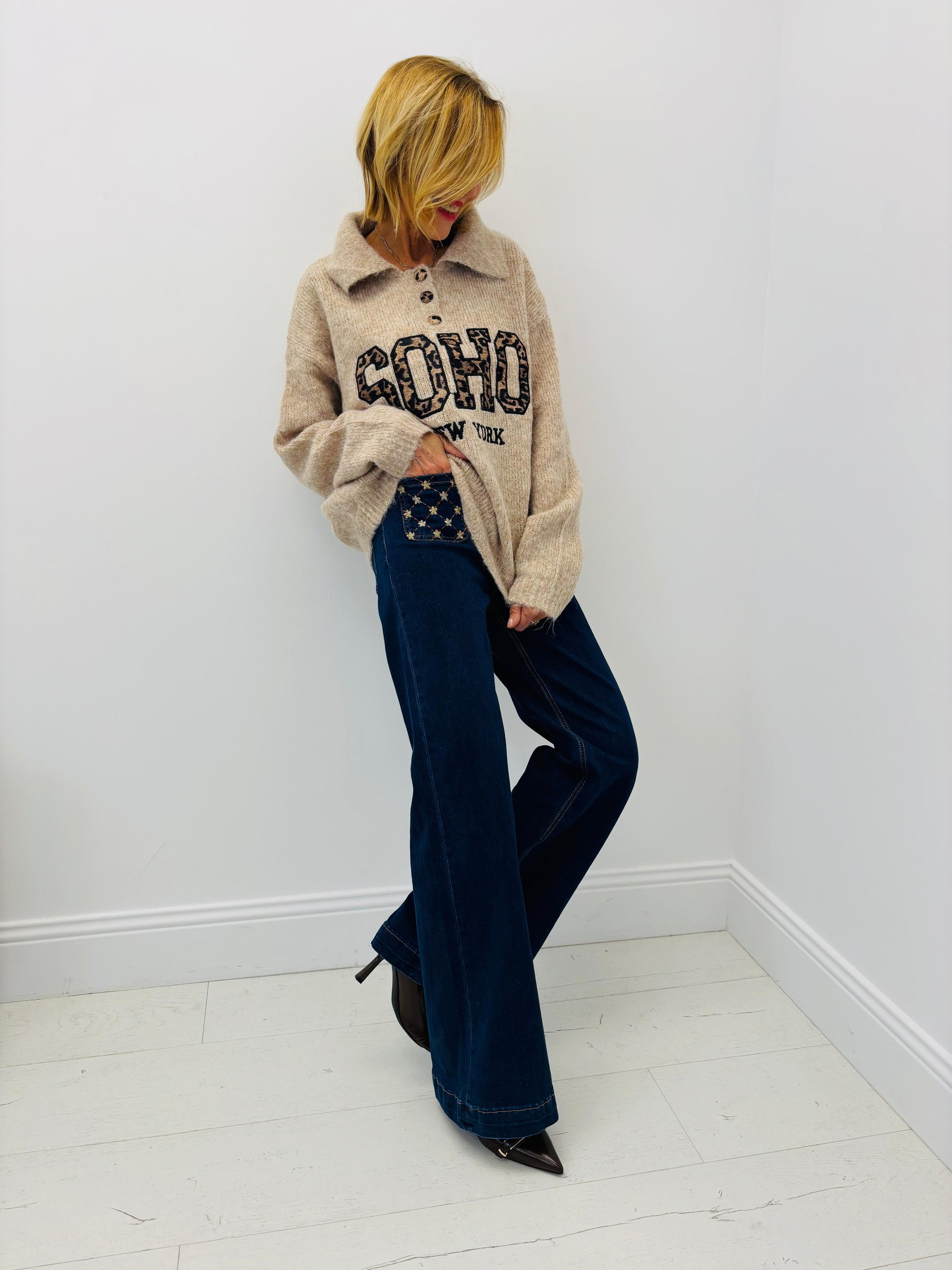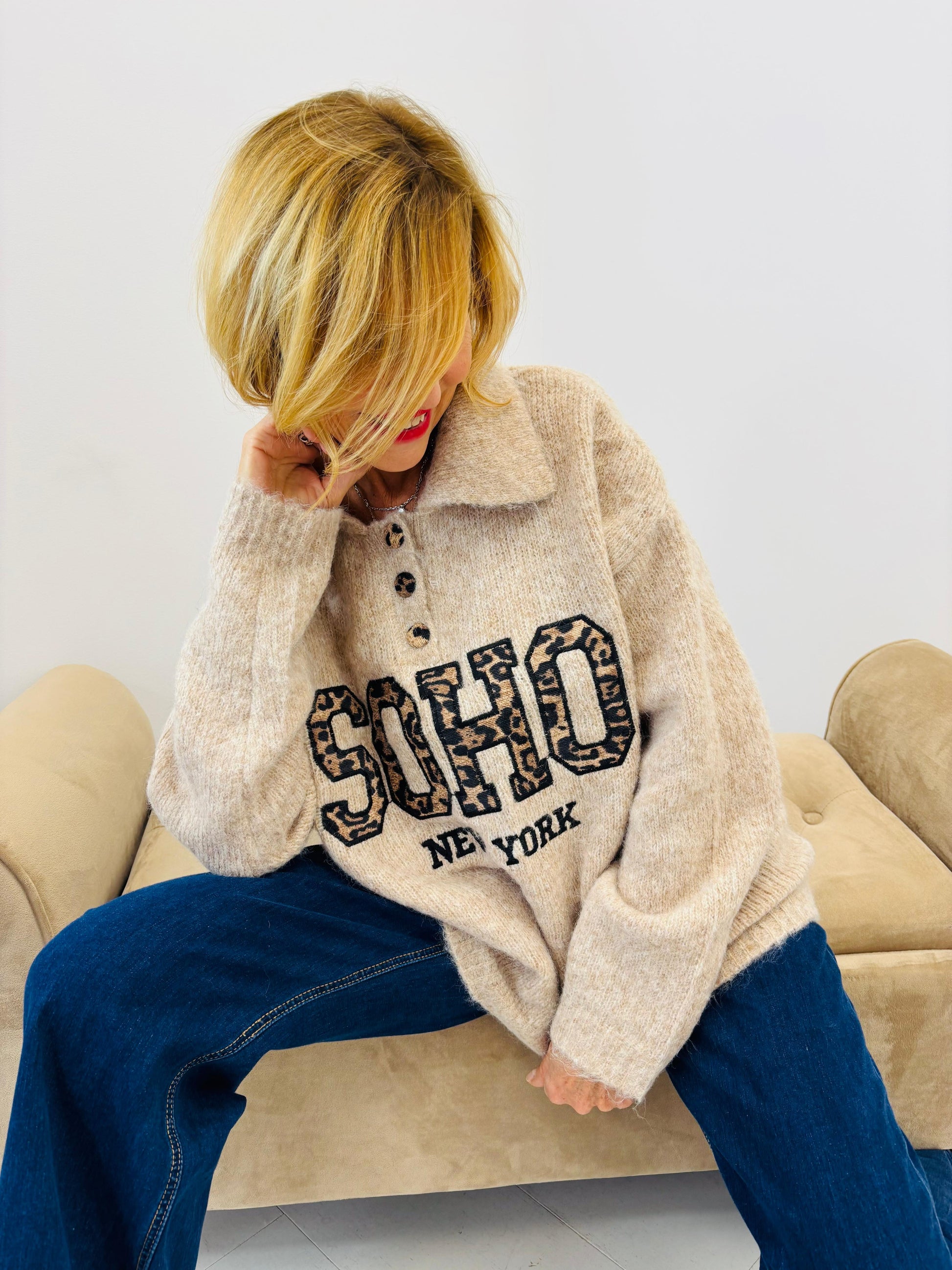 Avec son inscription “SOHO New York” en lettres léopard, il insuffle une touche tendance à votre look décontracté. Sa maille moelleuse couleur beige, son col polo boutonné et sa coupe loose en font une pièce parfaite pour un style cool et chic à la fois.